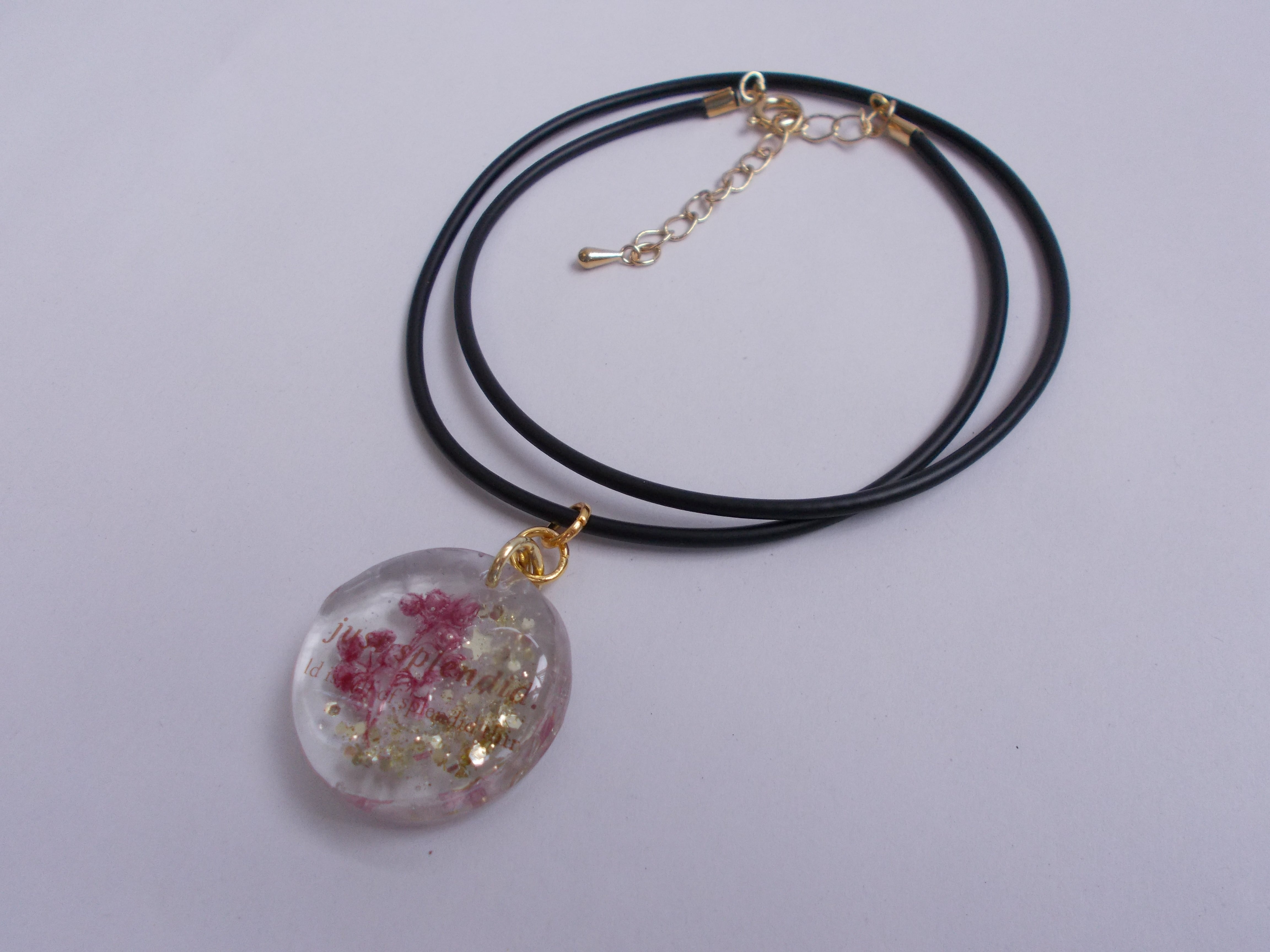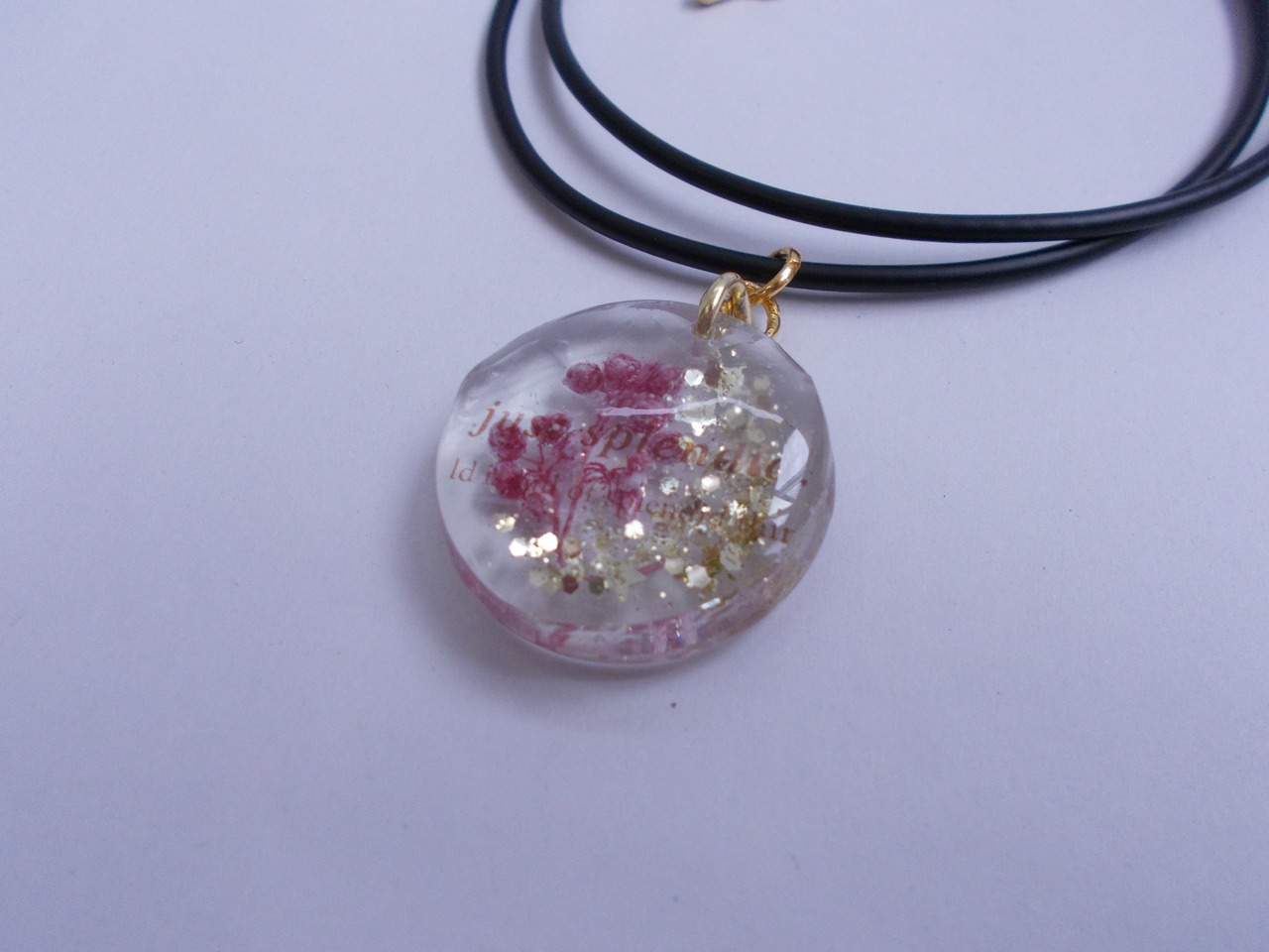 ・レジンで自作したペンダントトップと、通販サイトなどで購入したパーツを組み合わせて作成しています。長さは約45センチです。