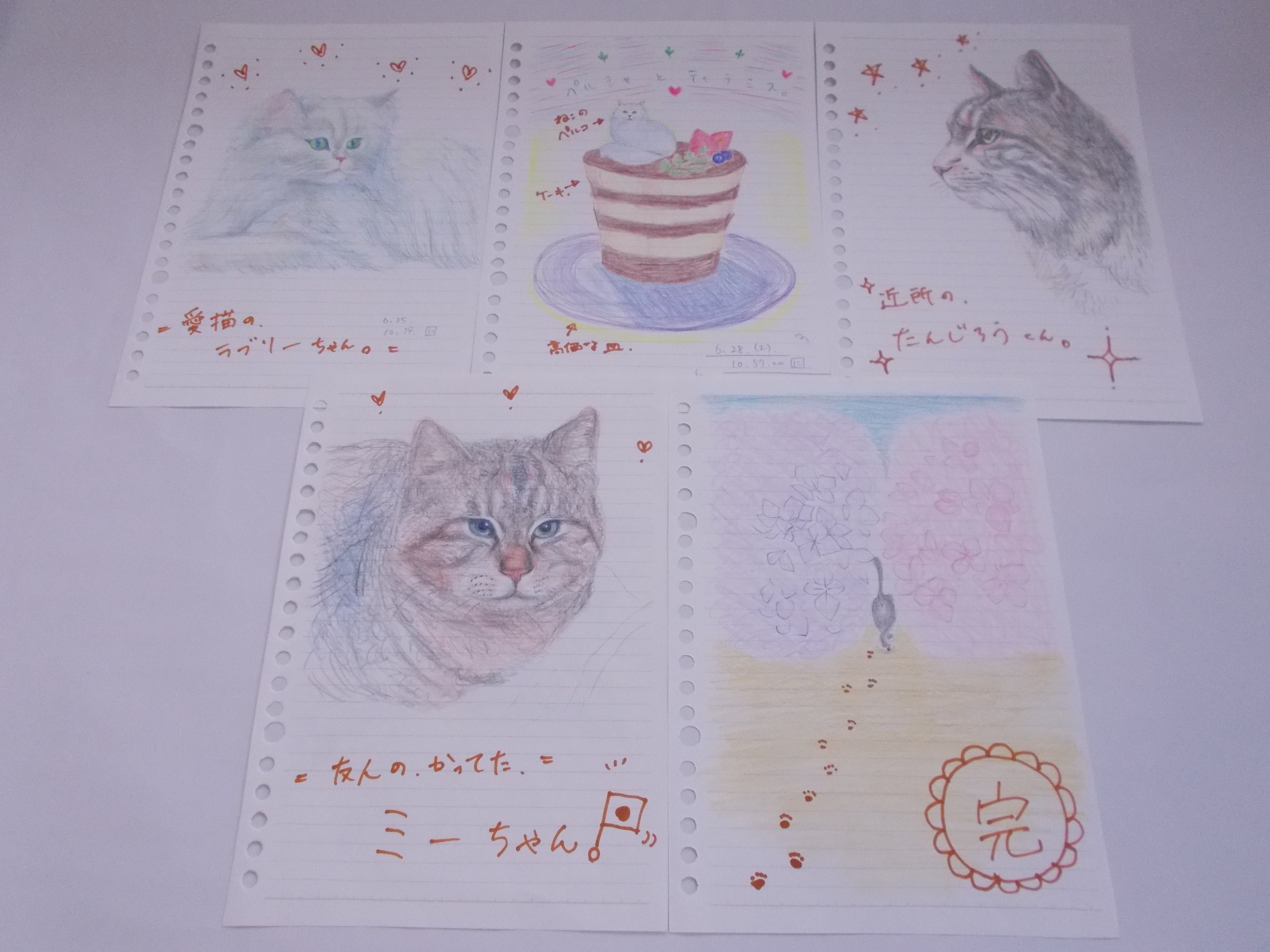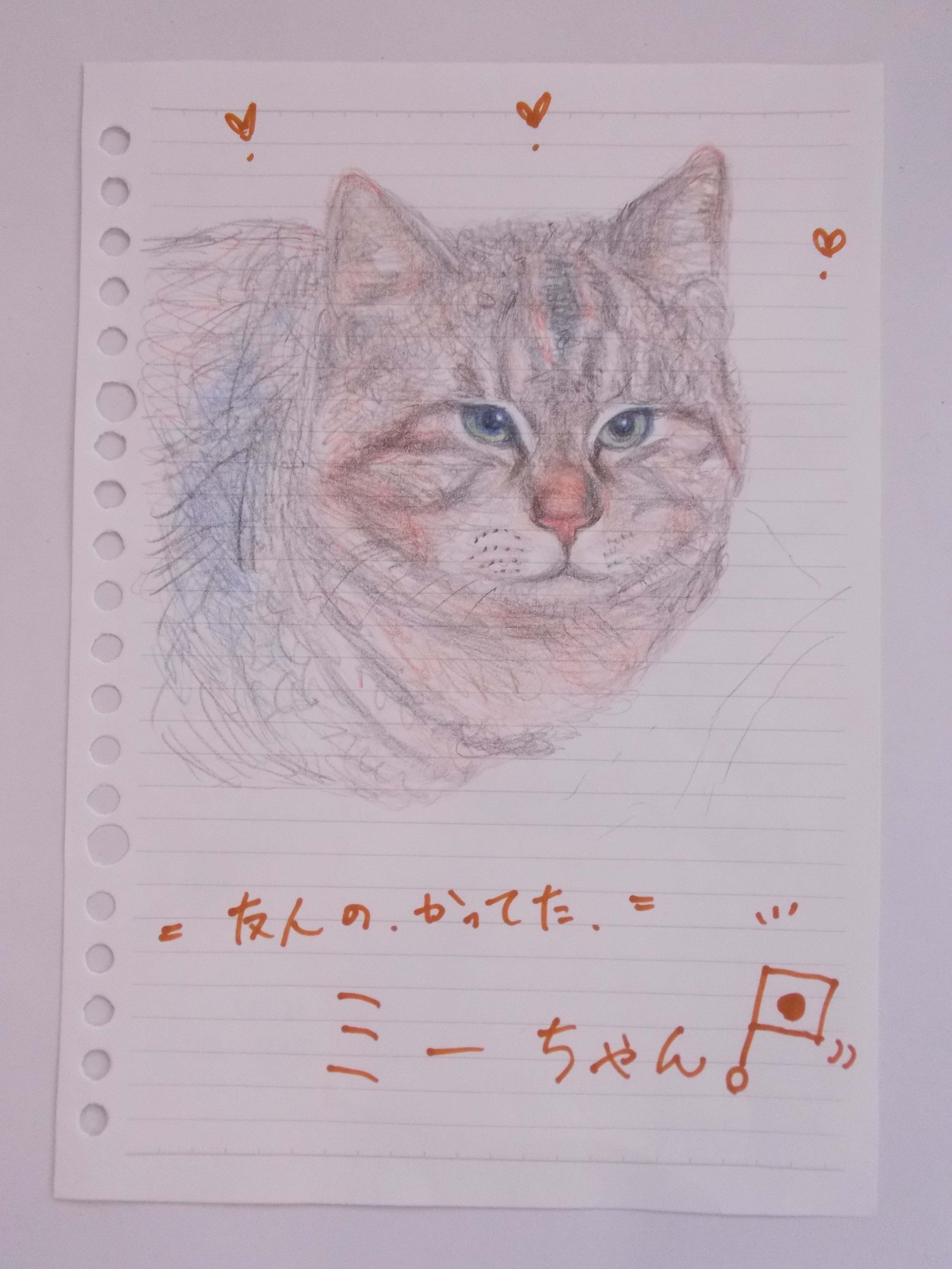 ・色鉛筆でA5のルーズリーフに描かれた猫の絵です。