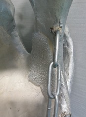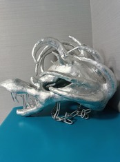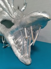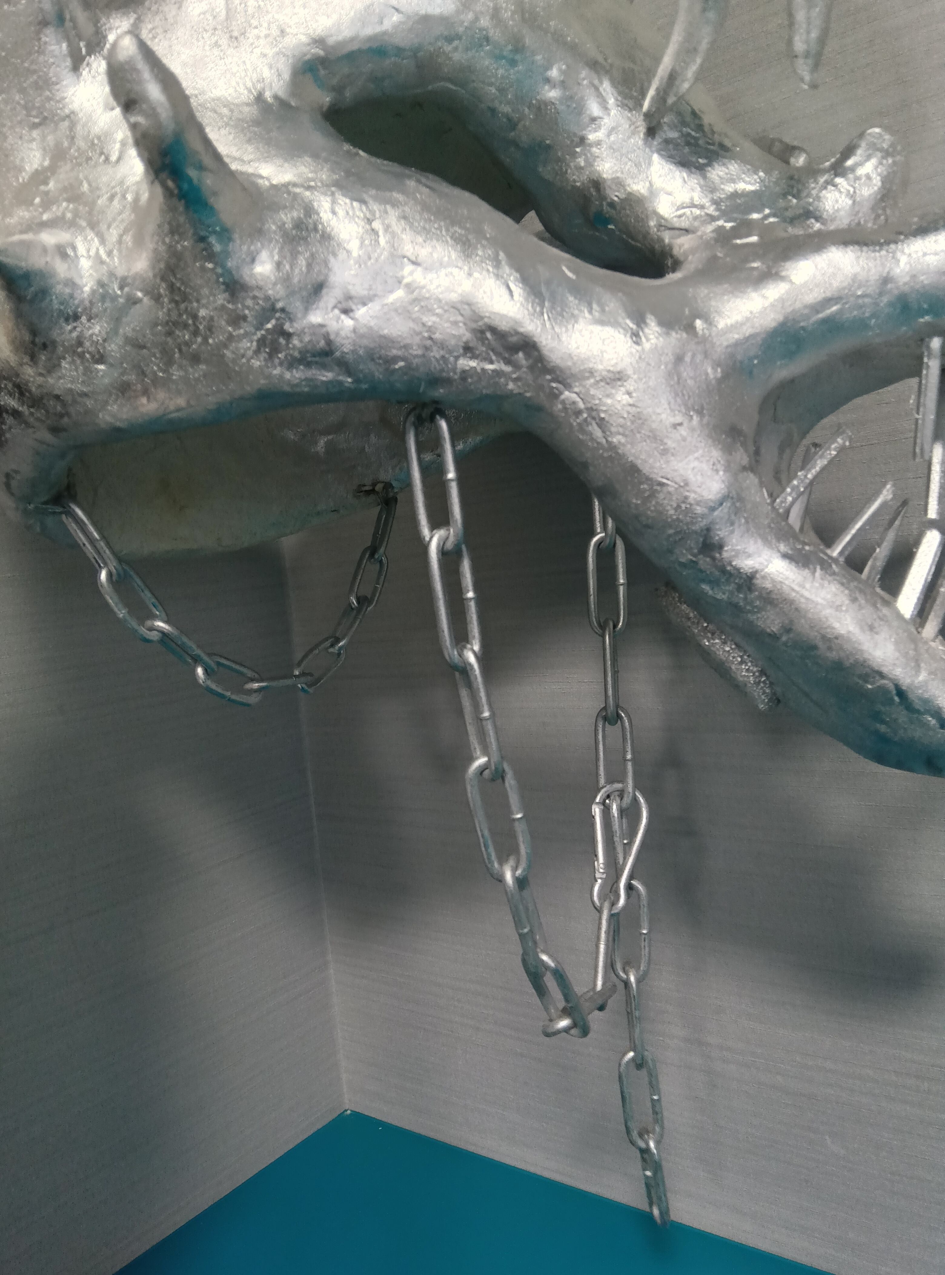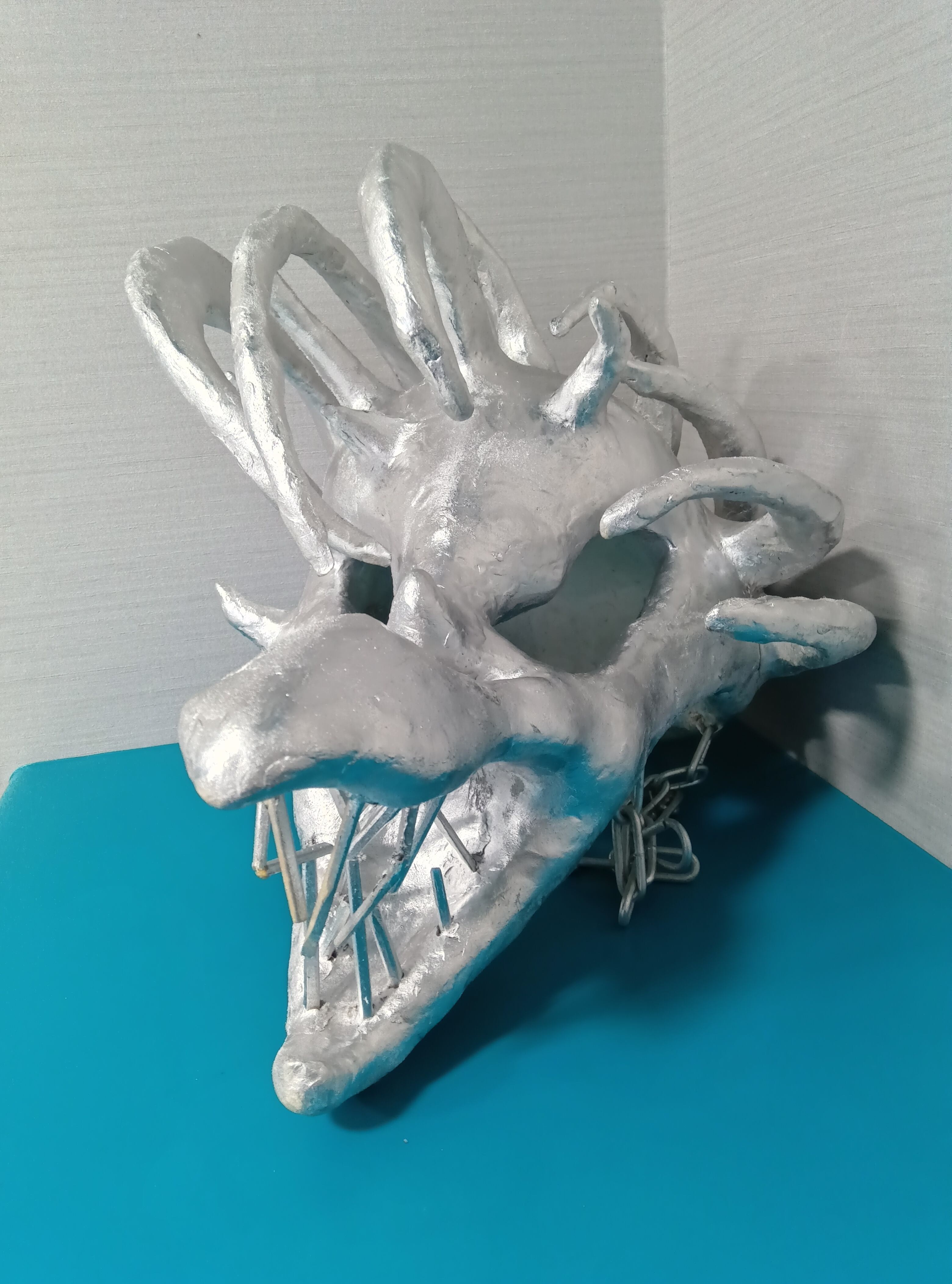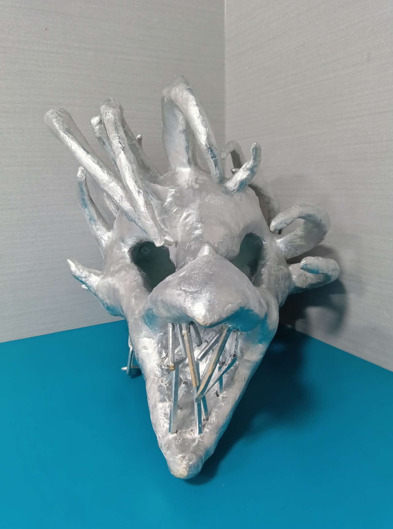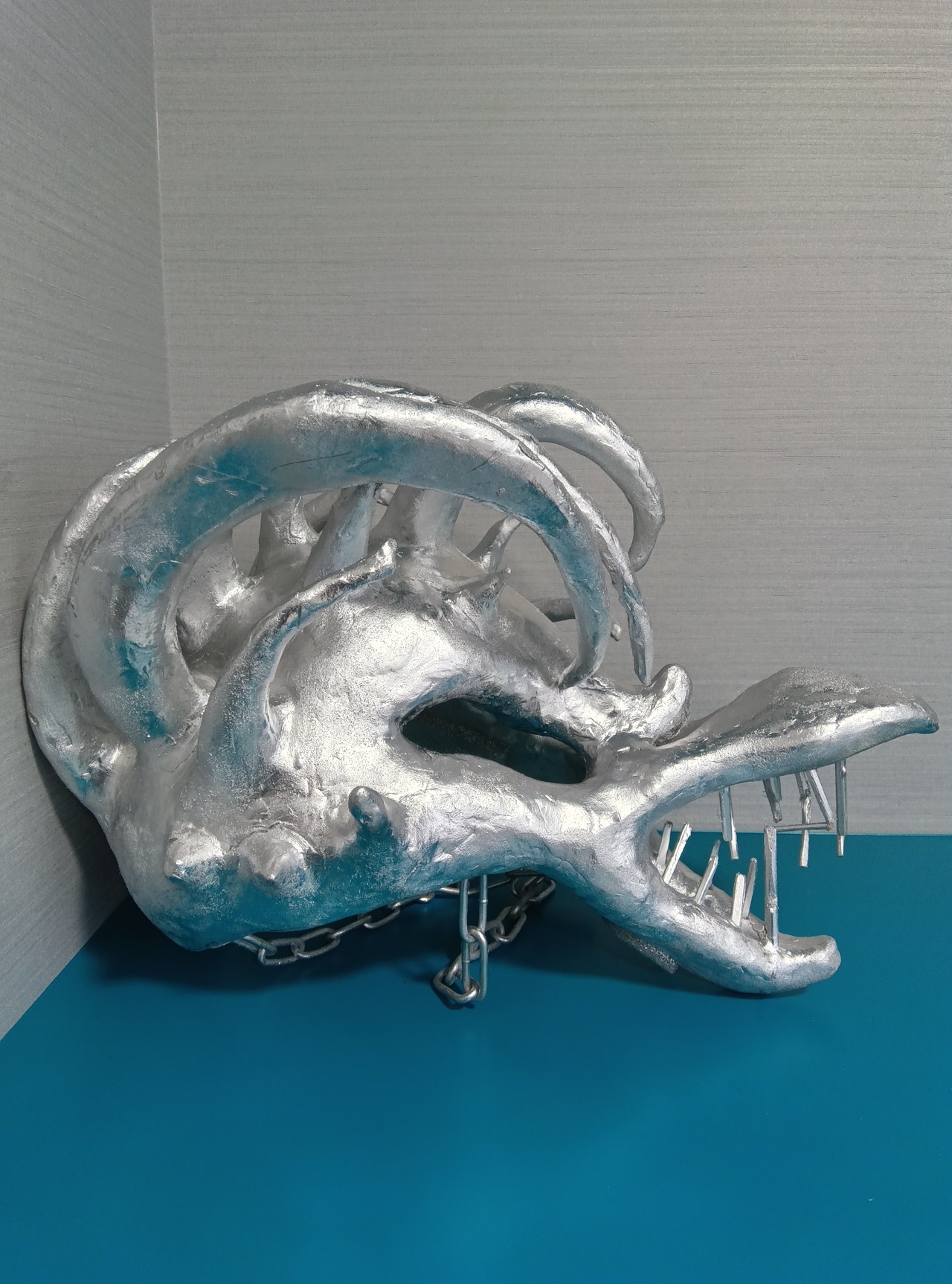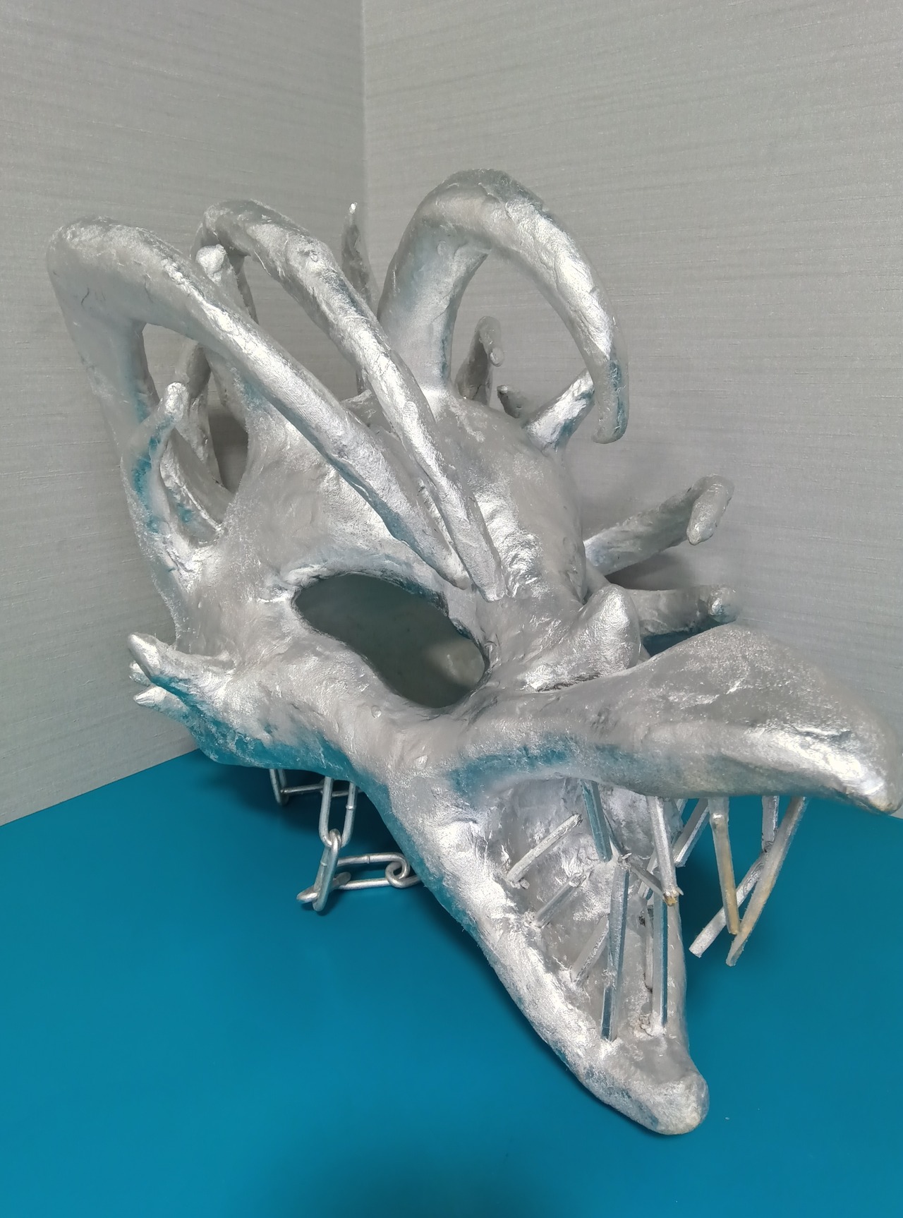 ・段ボール、石粉粘土、割り箸、流木、チェーン、クッション材などを使用し、表面は銀色のラッカーで着色しています。最後の写真のように、頭に被った際にこめかみに当たる部分にはクッション材を接着しています。