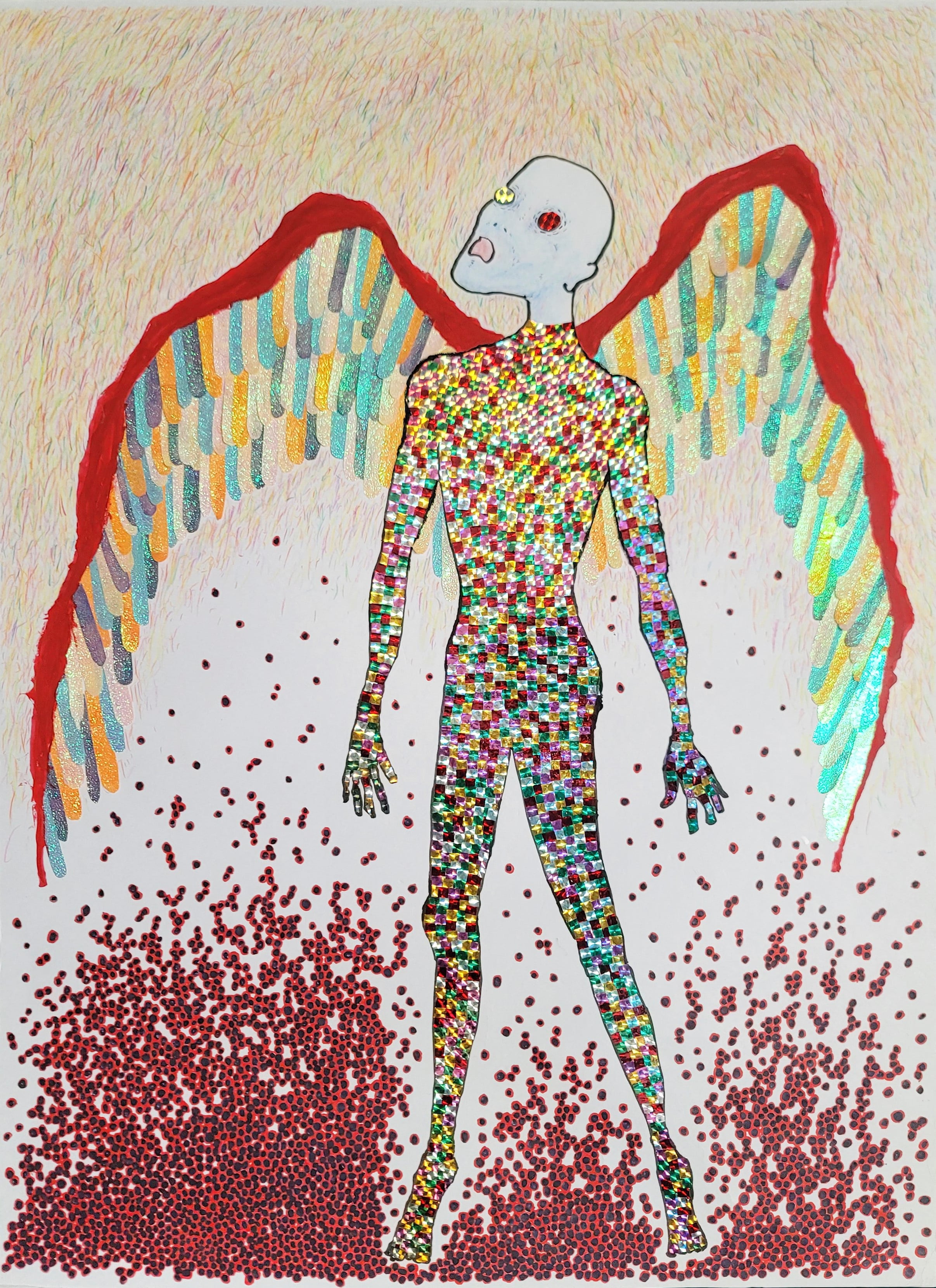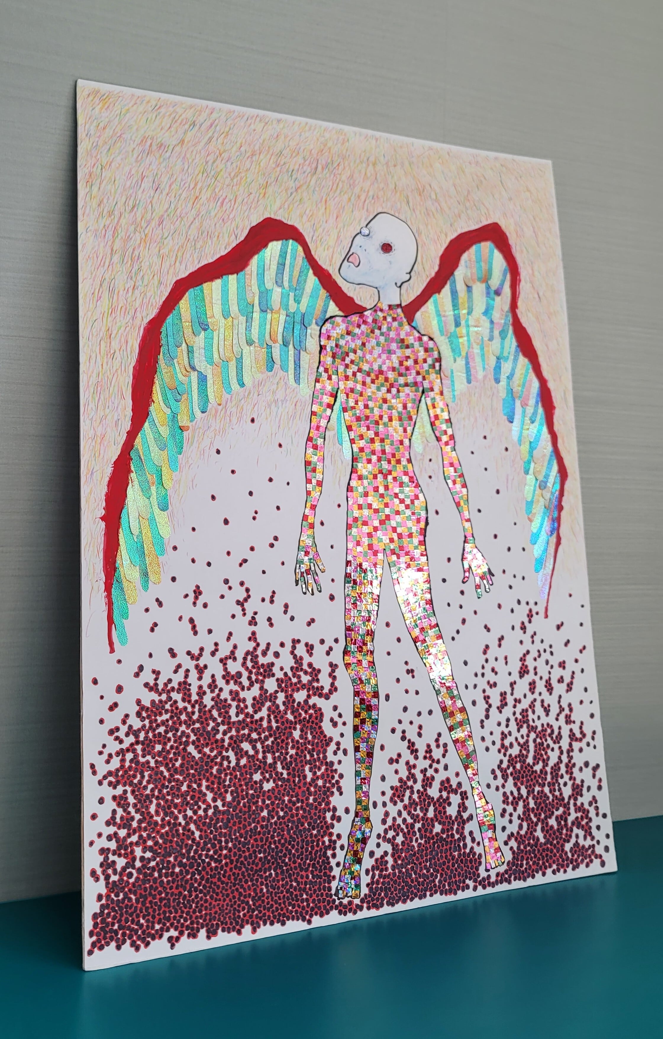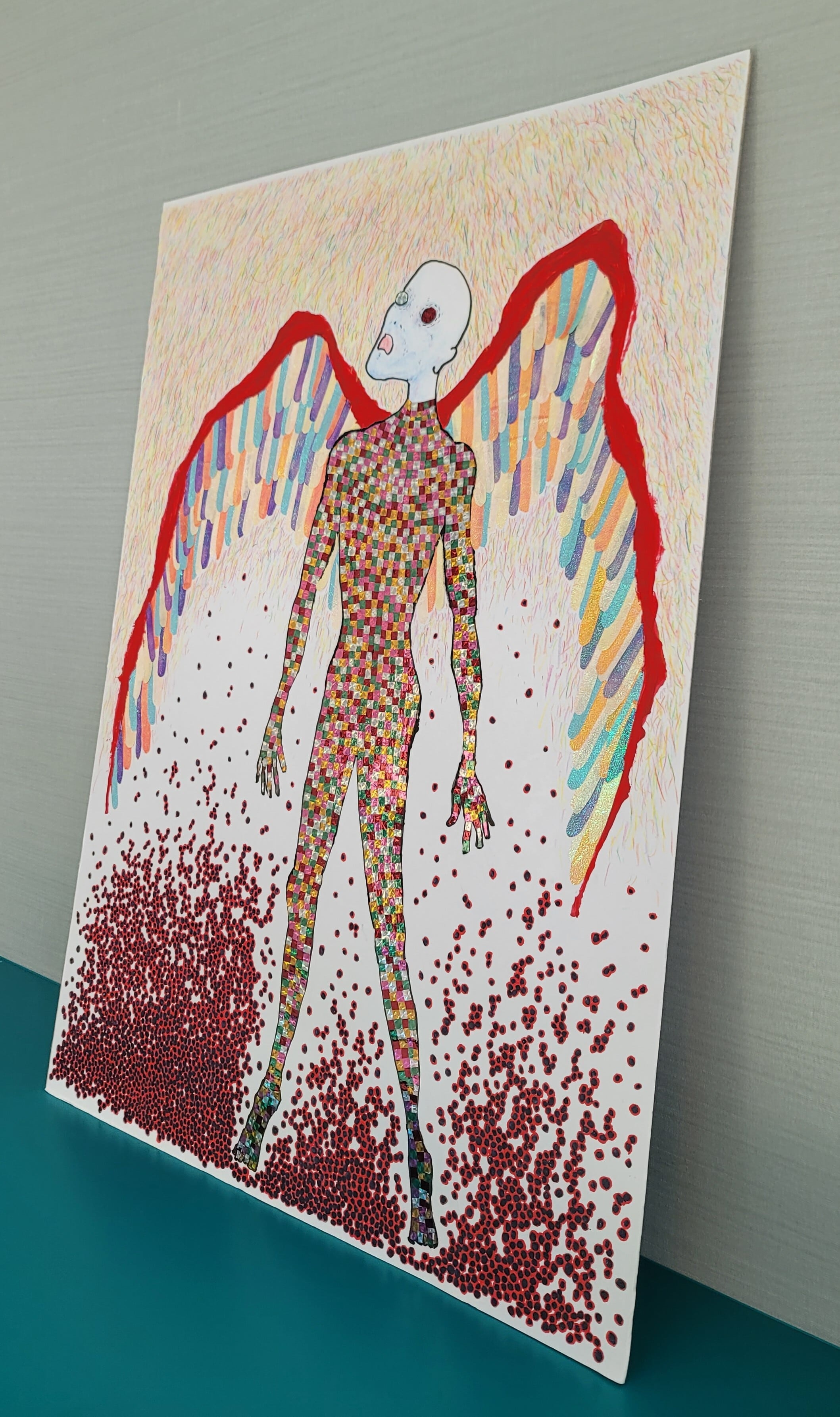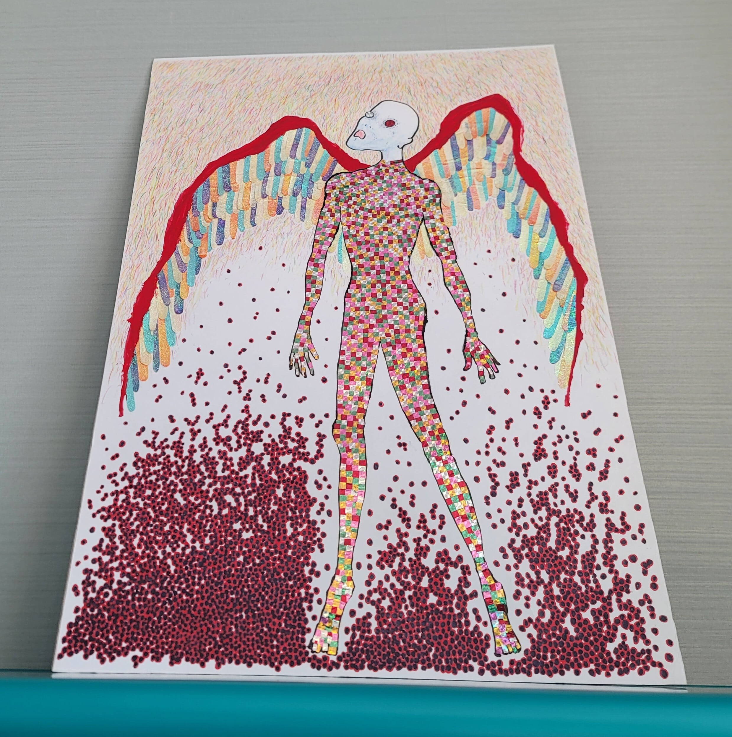 ・色鉛筆、マジックをベースに、キラキラの折り紙や包装紙を切り貼りしています。